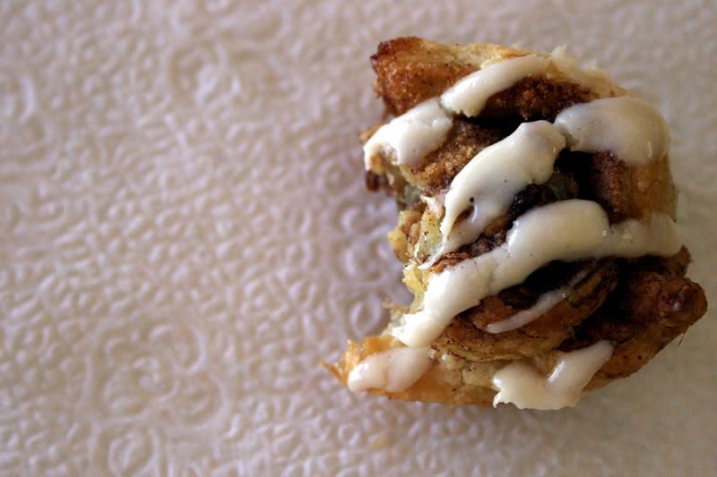 I made these cute mini-cinnamon rolls today. I needed something simple to get back in my baking groove. I don't think I'll be making these for a while though.. wayyyy too sweet. I mean, they were really good, but there was a whole lot of guilt, not to mention copious amounts of SUGAR, in every bite I took. Deciding to make and add the icing definitely did not help health matters at all. Oh well, whatever.