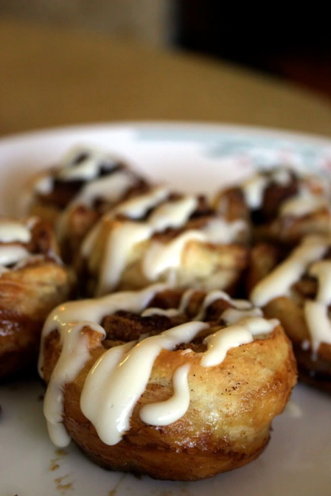 I made these cute mini-cinnamon rolls today. I needed something simple to get back in my baking groove. I don't think I'll be making these for a while though.. wayyyy too sweet. I mean, they were really good, but there was a whole lot of guilt, not to mention copious amounts of SUGAR, in every bite I took. Deciding to make and add the icing definitely did not help health matters at all. Oh well, whatever.